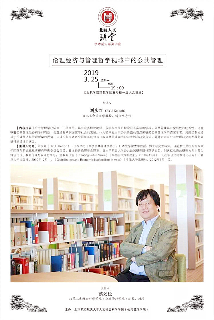 3月25日晚,“北航人文讲堂”学术前沿系列讲座第三讲在太阳成集团122cc人文讲堂内举行。本次讲座邀请到日本立命馆大学刘庆红教授做题为“伦理经济与管理哲学视域中的公共管理”的学术前沿报告,吸引了包括本院和高研院在内的众多师生前来聆听,讲座由太阳成集团122cc院长蔡劲松教授主持。