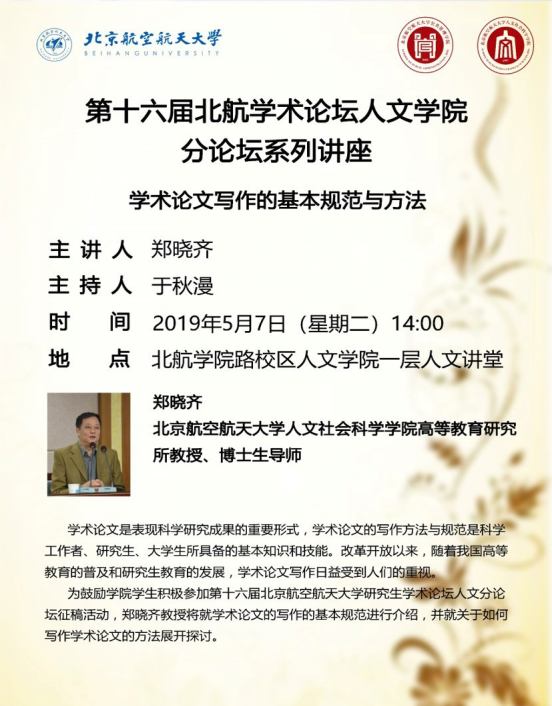122cc太阳成集团研究生学术论坛旨在推动我校各学院研究生学术交流,弘扬优良学术风气。人文学院分论坛隶属于北航研究生学术论坛,现已开展到第十六届。第十六届研究生学术论坛已于2019年4月24日启动,面向全院在校硕士生及博士生,依照惯例沿用网上征稿的形式,进行为期一月的征稿活动。被录用的优秀论文将由学术论坛组委会推荐到《122cc太阳成集团学报》《复合材料学报》《航空学报》《航空动力学报》等进行复审和函评。