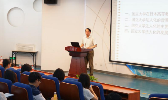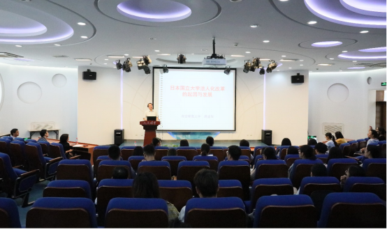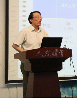 讲座开始,胡教授就直奔主题,提出观点:日本国立大学法人化是近年来日本国立大学改革、高等教育改革的重点。接下来,胡建华教授从四个方面展开本次讲座。第一部分是国立大学在日本高等教育体系中的地位。日本国立大学更加偏重于研究生教育,这就决定了国立大学研究能力更强,胡建华教授运用国立大学与私立大学、公立大学的数字对比,来论述国立大学的作用与地位,不论是在人才培养方面、科学研究方面还是建设一流大学方面,国立大学的数量都是远远高于私立大学和公立大学的,所以日本国立大学在推动日本高等教育发展、推动日本研究型人才增长、社会科研创新能力提升等方面,发挥了重要作用。