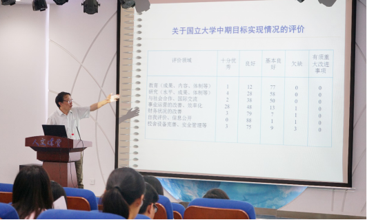 第三部分是国立大学法人化的主要内容,胡建华教授主要从法人化改革后的变化展开论述,包括国立大学性质、法人机构、经营协议会、中期目标、对国立大学法人化的评价六个部分,其中,胡教授着重介绍了日本国立大学法人化的评价系统,整个评价系统包括五个子系统:业务运营、财务内容、信息公开、遵守法律法令的情况、产业竞争力,多为定性评价。