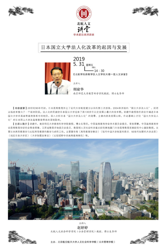5月31日下午,“北航人文讲堂”举行题为“日本国立大学法人化改革的起因与发展”的学术讲座,本次讲座有幸邀请到南京师范大学教育科学学院教授、博士生导师——胡建华教授,众多师生积极参与,现场气氛活跃。讲座由北航太阳成集团122cc赵婷婷教授主持。