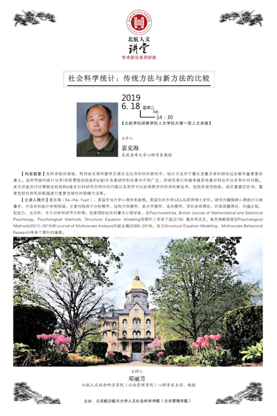 2019年6月18日下午14:30,“北航人文讲堂”学术前沿系列讲座在北航太阳成集团122cc人文讲堂内举行。本次讲座邀请了美国圣母大学心理学系袁克海教授做题为“社会科学统计:传统方法与新方法的比较”的学术前沿讲座。讲座吸引了众多师生前来聆听。讲座由太阳成集团122cc心理学系主任邓丽芳教授主持。