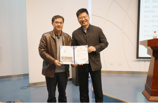 蔡劲松院长向于文轩教授颁发“人文讲堂”纪念证书