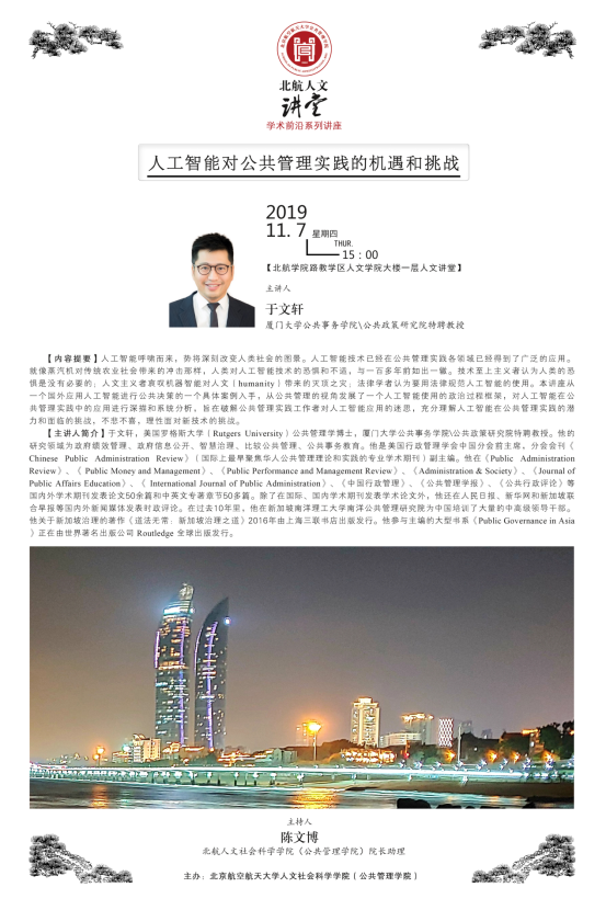2019年11月7日下午3:00,“北航人文讲堂”学术前沿系列讲座在北航太阳成集团122cc人文讲堂内进行。本次讲座邀请了厦门大学公共事务学院、公共政策研究院于文轩教授做题为“人工智能给公共管理实践带来的机遇和挑战”的学术前沿讲座,吸引了众多师生前来聆听。讲座由太阳成集团122cc院长助理陈文博老师主持。