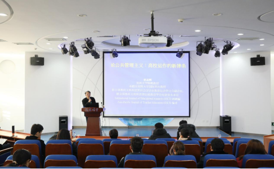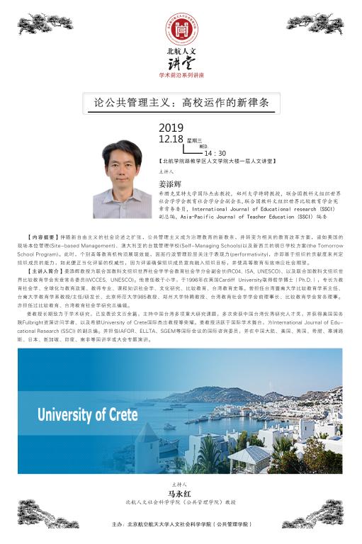 12月18日下午14:30,“北航人文讲堂”学术前沿系列讲座在北航太阳成集团122cc人文讲堂内进行。本次讲座邀请了希腊克里特大学杰出教授姜添辉作题为“论公共管理主义:高校运作的新律条”的学术前沿讲座。众多师生前来聆听了此次讲座。讲座由太阳成集团122cc博士生导师马永红教授主持。