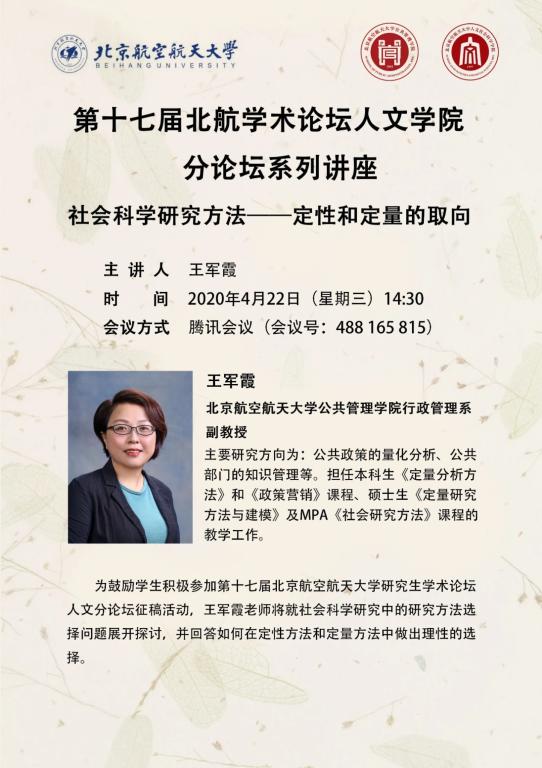 122cc太阳成集团研究生学术论坛旨在推动我校各学院研究生学术交流,弘扬优良学术风气。人文学院分论坛隶属于北航研究生学术论坛,现已开展到第十七届。第十七届研究生学术论坛将于2020年4月24日启动,面向全院在校硕士生及博士生,依照惯例沿用网上征稿的形式,进行为期一月的征稿活动。被录用的优秀论文将由学术论坛组委会推荐到《122cc太阳成集团学报》《复合材料学报》《航空学报》《航空动力学报》等进行复审和函评。