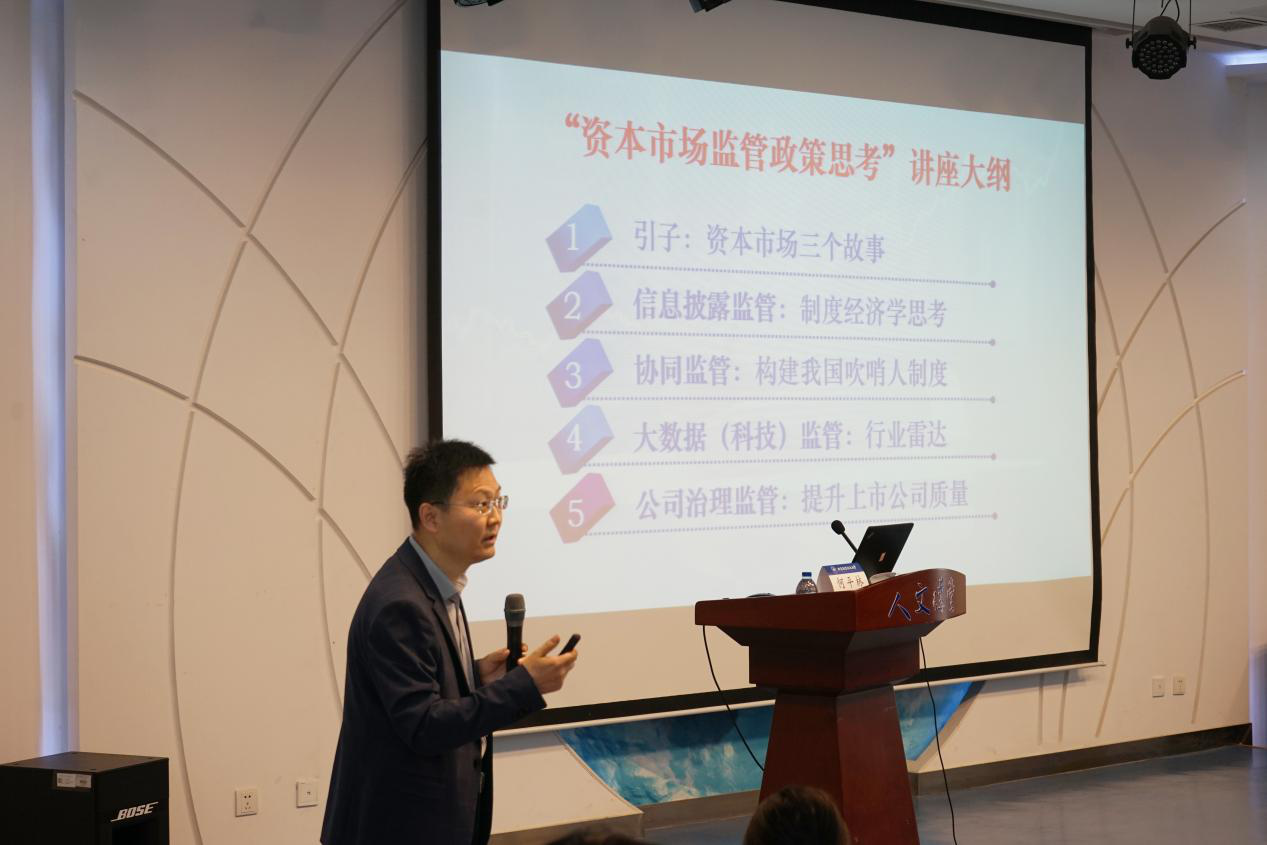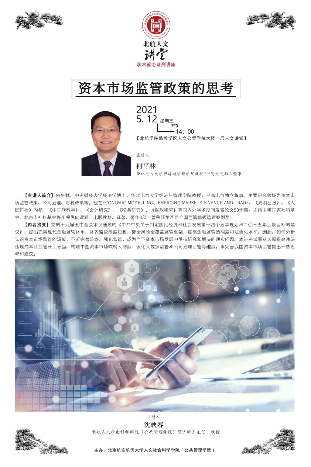5月12日,北航“人文讲堂”学术前沿系列讲座在太阳成集团122cc人文讲堂举行,本次讲座邀请了华北电力大学经济与管理学院教授何平林作题为“资本市场监管政策的思考”的学术前沿讲座。讲座由太阳成集团122cc经济学系主任沈映春教授主持,学院院长蔡劲松教授,分党委书记王琪全,学院副院长任丙强教授等出席讲座。