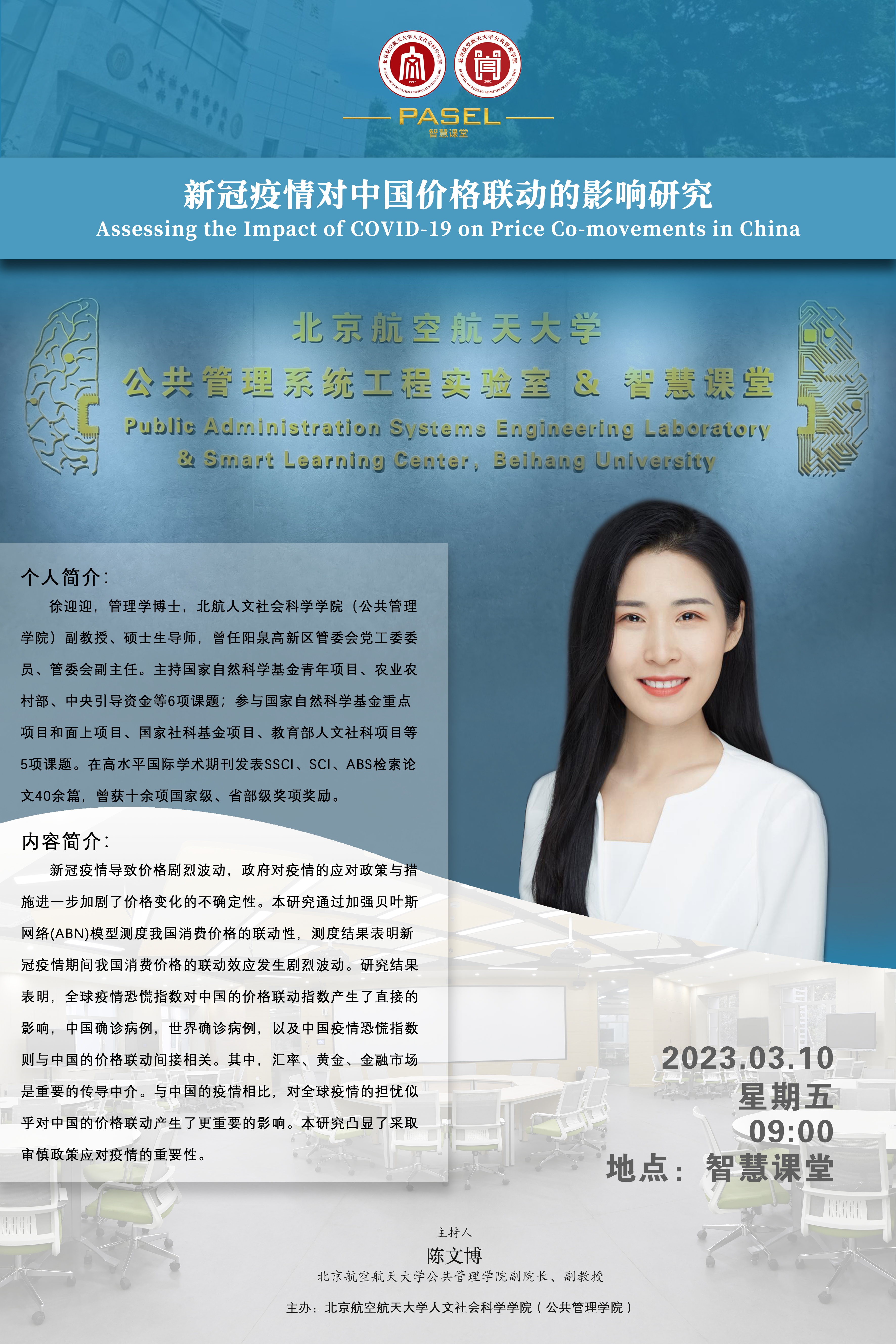 3月10日,“PASEL·智慧讲堂”系列讲座在北航人文公管学院智慧课堂举办。本期讲座由徐迎迎副教授主讲“新冠疫情对中国价格联动的影响研究”。学院院长蔡劲松,副院长詹承豫、陈文博,教师代表何平林、黄文、牛朝辉、吴培熠以及30多位学生参加讲座并互动研讨,讲座由学院副院长陈文博主持。