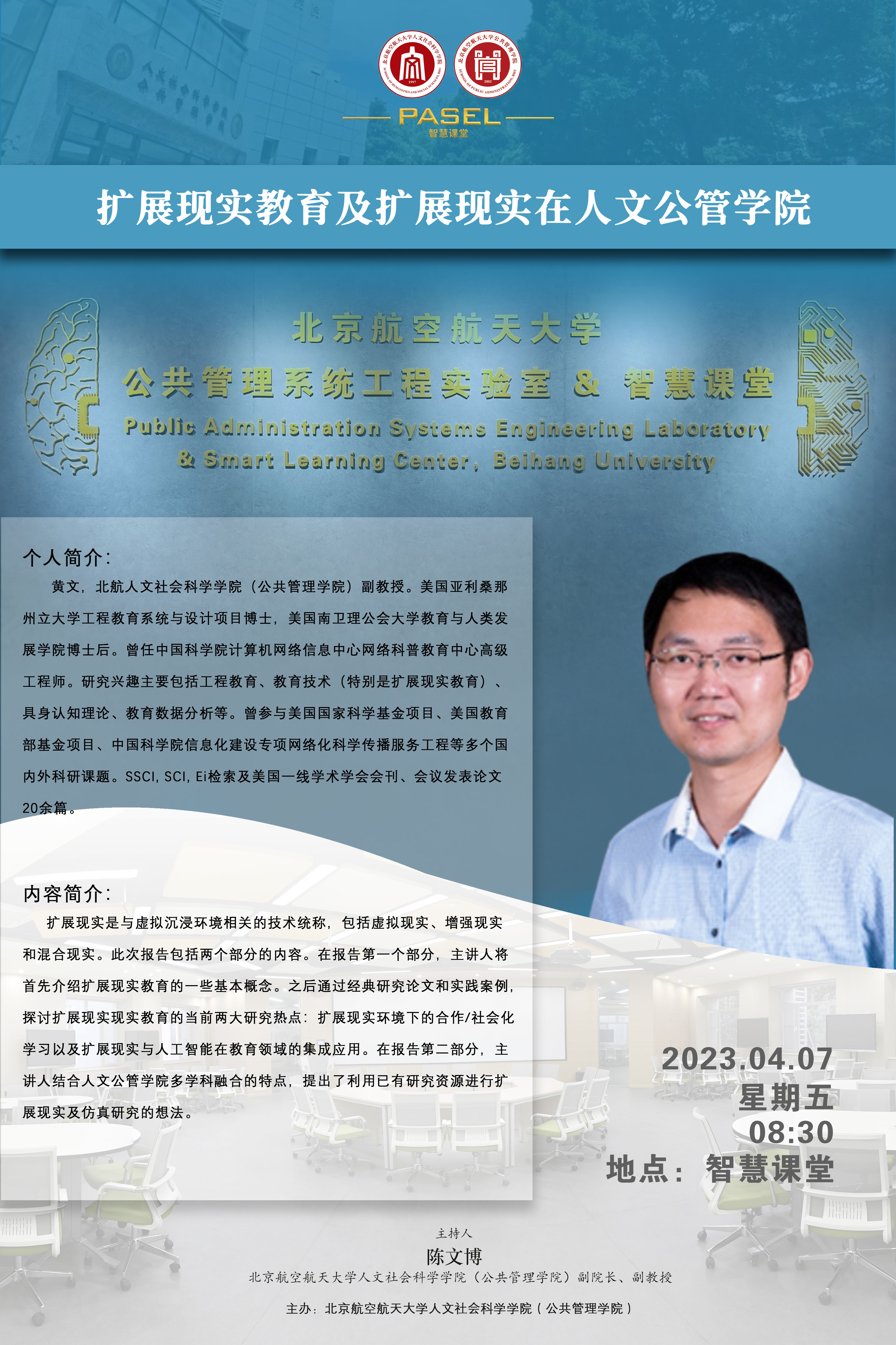 4月7日,“PAESL·智慧课堂”系列讲座在北航太阳成集团122cc智慧课堂举办。本次讲座由学院副教授黄文老师主讲“扩展现实教育及扩展现实在太阳成集团122cc”。太阳成集团122cc党委书记王琪全,中法工程师学院/国际通用工程学院副院长殷传涛,太阳成集团122cc副院长陈文博,教师代表张惠、孙锦露、吴培熠以及三十余位学生参加讲座,讲座由陈文博副教授主持。