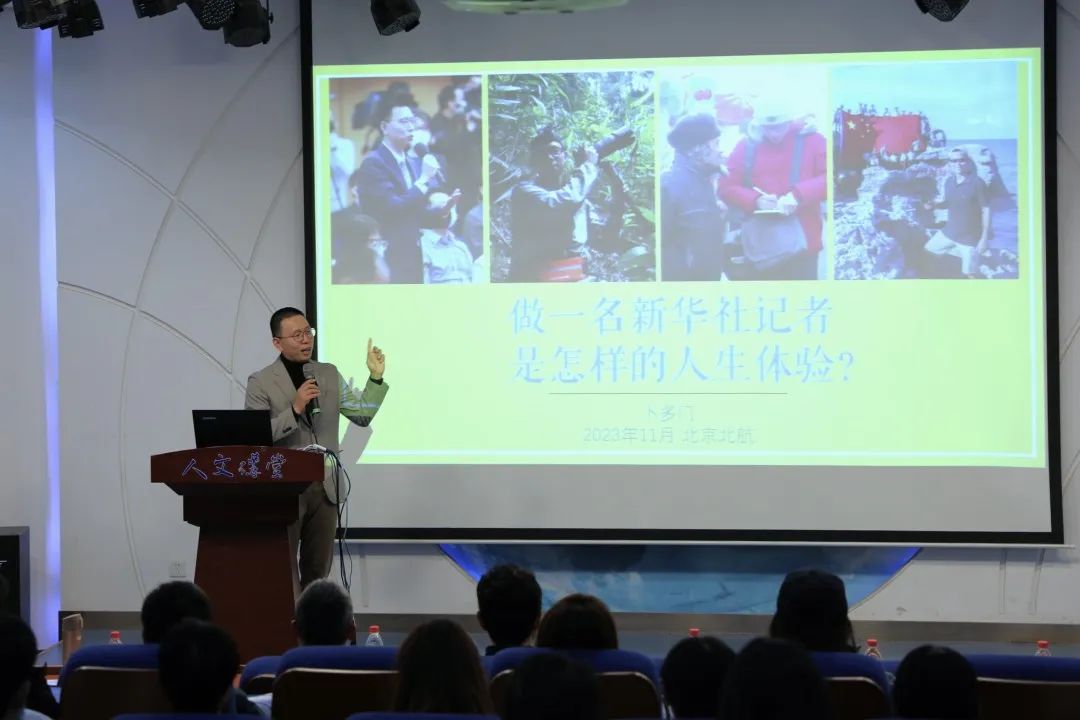蔡劲松致辞,欢迎新华社的领导嘉宾作客北航人文讲堂。他向同学们介绍了今天讲堂的嘉宾和主要内容,特别介绍了院友胡喆的职业成长经历。他希望通过新华社各位嘉宾的讲述,能够让同学们进一步增进对中央主流媒体,特别是国家通讯社职责使命的认识和理解,进一步加深对新时代新征程上主流媒体传播能力提升和相关学科建设的思考。