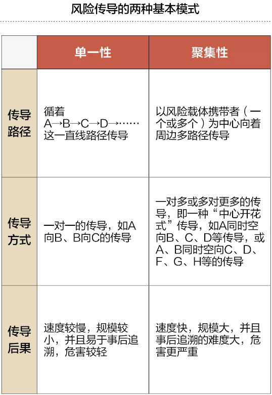 第二,重大风险传导具有两种最基本的模式,即单一性传导模式和聚集性传导模式,当然还可以派生出其它多种模式。从传导的后果看,聚集性传导模式的传导速度更快,规模更大,更难追溯,后果更严重。因此,从传导模式看,我们在防范和控制重大风险时,应重点注意聚集性传导,重点堵住聚集性传导路径,谨防重大风险聚集性传导和扩散现象的发生。