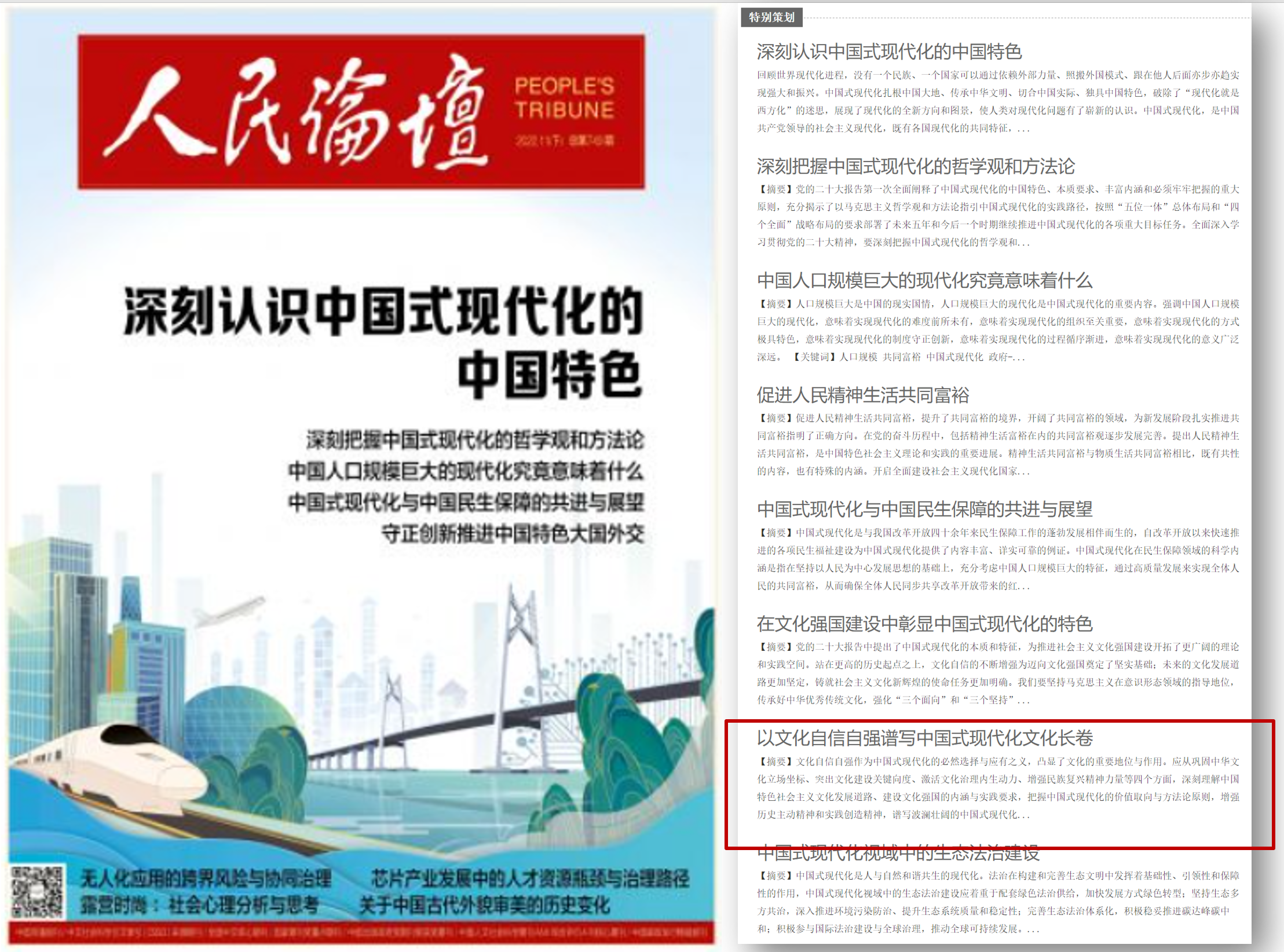 编者按:我院院长蔡劲松教授撰写的阐释党的二十大精神文章《以文化自信自强谱写中国式现代化文化长卷》,刊发于人民日报社《人民论坛》杂志2022年第11月下期“特别企划”栏目,全文如下。