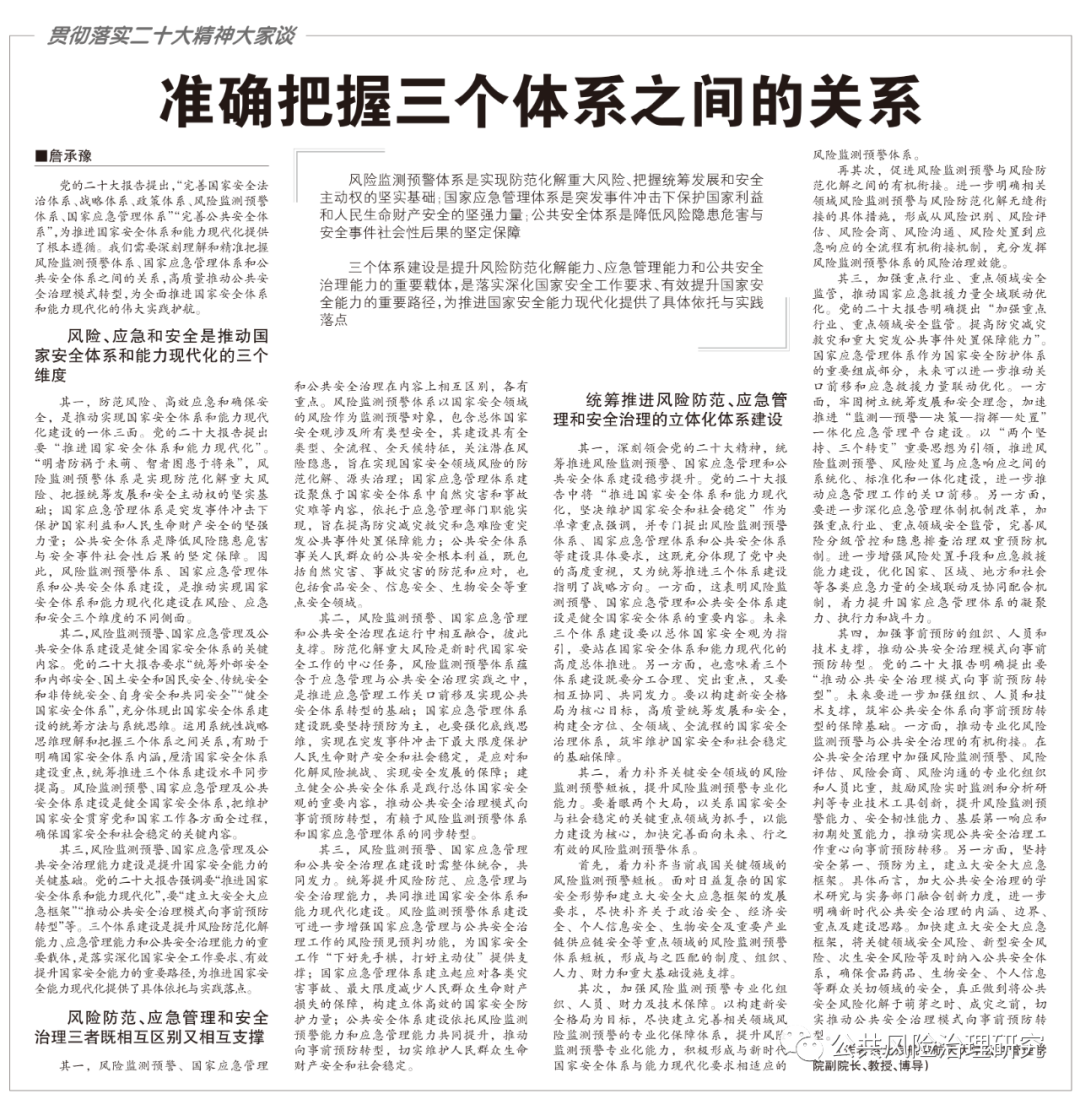 近日,122cc太阳成集团公共管理学院副院长詹承豫教授接受《中国应急管理报》邀请,就贯彻落实党的二十大报告,理解和把握风险监测预警体系、国家应急管理体系和公共安全治理体系之间的逻辑关系做出阐释,发表《准确把握三个体系之间的关系》,以下为文章全文。
